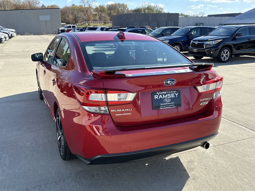 Impreza Sport is nicely equipped with Moonroof & BSD/RCTA & HK Audio & Power Dr. Seat (6-Way Power Drivers Seat, Blind Spot Detection (BSD), harman/kardon Speaker System, Power Moonroof, and Rear Cross Traffic Alert (RCTA) System), Popular Package #1 (All-Weather Floor Liners, Auto-Dimming Exterior Mirror w/Approach Light, Auto-Dimming Mirror w/Compass & HomeLink, Cargo Tray, and Rear Bumper Applique), Subaru Certified Pre-Owned Certified, 4-Wheel Disc Brakes, 6 Speakers, ABS brakes, Air Conditioning, Alloy Wheel Locks, Alloy wheels, AM/FM radio: SiriusXM, Anti-whiplash front head restraints, Brake assist, Bumpers: body-color, CD player, Delay-off headlights, Driver door bin, Driver vanity mirror, Dual front impact airbags, Dual front side impact airbags, Electronic Stability Control, Emergency communication system, Exterior Parking Camera Rear, Four wheel independent suspension, Front anti-roll bar, Front Bucket Seats, Front Center Armrest, Front reading lights, Fully automatic headlights, Heated door mirrors, Heated Front Bucket Seats, Heated front seats, Illuminated entry, Knee airbag, Leather Shift Knob, Low tire pressure warning, Occupant sensing airbag, Outside temperature display, Overhead airbag, Overhead console, Panic alarm, Passenger door bin, Passenger vanity mirror, Power door mirrors, Power steering, Power windows, Radio data system, Radio: Subaru STARLINK 8.0 Multimedia Plus System, Rear anti-roll bar, Rear window defroster, Remote keyless entry, Security system, Speed control, Speed-sensing steering, Split folding rear seat, Spoiler, Sport-Trimmed Upholstery, STARLINK/Apple CarPlay/Android Auto, Steering wheel mounted audio controls, Tachometer, Telescoping steering wheel, Tilt steering wheel, Traction control, Trip computer, Turn signal indicator mirrors, Variably intermittent wipers, and Wheels: 18 x 7.5 Machine Finish J Aluminum-Alloy.