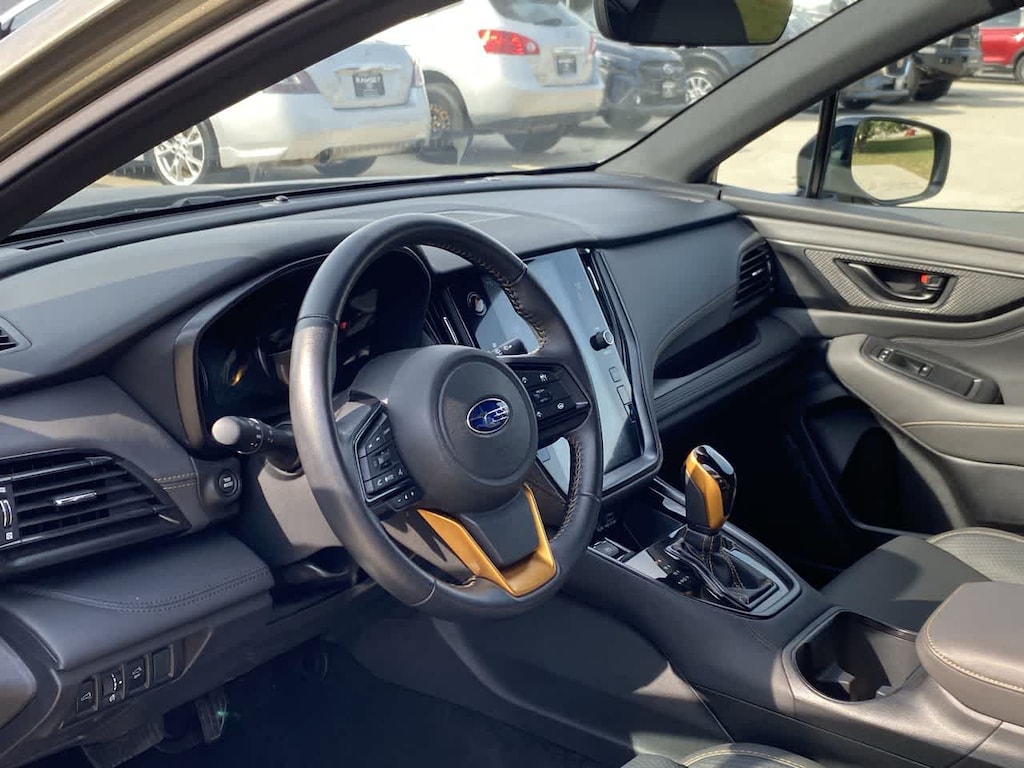 Outback Wilderness is nicely equipped with Standard Model, Subaru Certified Pre-Owned Certified, 4-Wheel Disc Brakes, 4.444 Axle Ratio, 6 Speakers, ABS brakes, Air Conditioning, Alloy wheels, AM/FM radio: SiriusXM, Auto High-beam Headlights, Auto-dimming Rear-View mirror, Automatic temperature control, Brake assist, Compass, Driver door bin, Driver vanity mirror, Dual front impact airbags, Dual front side impact airbags, Electronic Stability Control, Emergency communication system: STARLINK Safety Plus (3-year free trial), Exterior Parking Camera Rear, Four wheel independent suspension, Front anti-roll bar, Front Bucket Seats, Front Center Armrest w/Storage, Front dual zone A/C, Front fog lights, Front reading lights, Fully automatic headlights, Garage door transmitter: HomeLink, Heated door mirrors, Heated Front Bucket Seats, Heated front seats, Heated rear seats, Illuminated entry, Knee airbag, Leather steering wheel, Low tire pressure warning, Occupant sensing airbag, Outside temperature display, Overhead airbag, Overhead console, Panic alarm, Passenger door bin, Passenger vanity mirror, Power door mirrors, Power driver seat, Power Liftgate, Power passenger seat, Power steering, Power windows, Radio: Subaru STARLINK 11.6 Multimedia Plus Sys, Rear anti-roll bar, Rear Seat Back Protector, Rear seat center armrest, Rear window defroster, Rear window wiper, Remote keyless entry, Roof rack, Security system, Speed control, Speed-sensing steering, Split folding rear seat, Spoiler, StarTex-Trimmed Upholstery, Steering wheel mounted audio controls, Steering Wheel Paddle Shift Control Switches, Tachometer, Telescoping steering wheel, Tilt steering wheel, Traction control, Trip computer, Turn signal indicator mirrors, Variably intermittent wipers, and Wheels: 17 x 7J Black Aluminum Alloy.