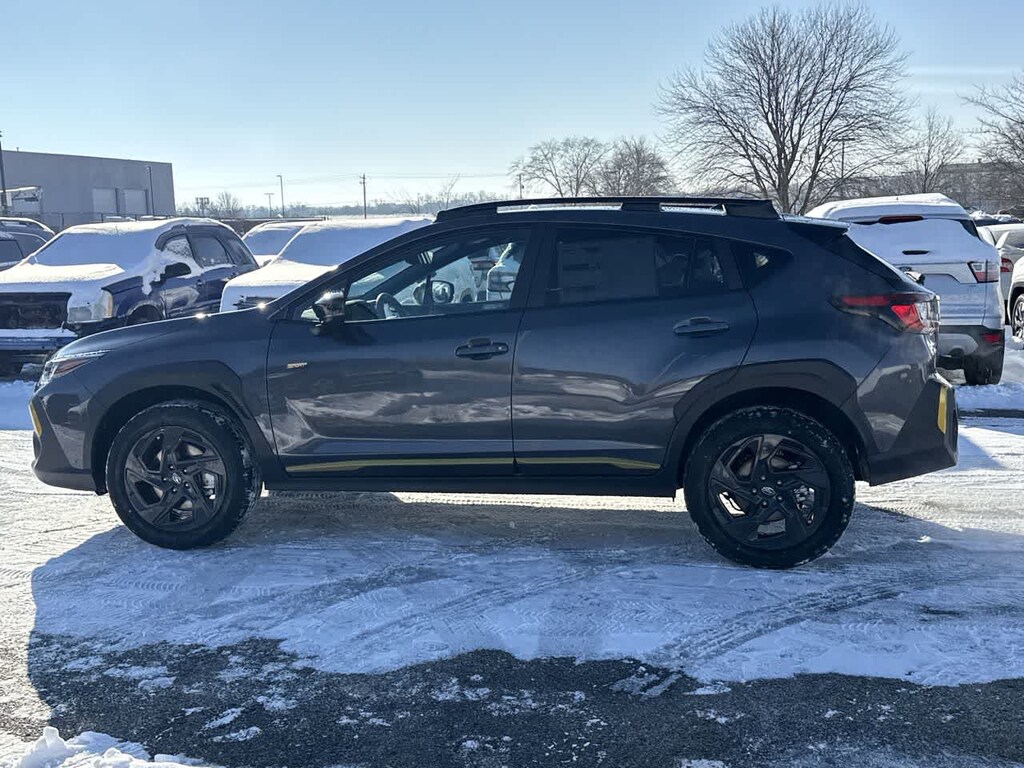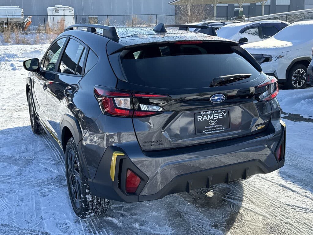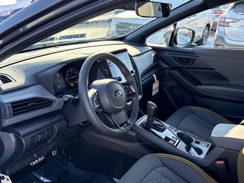 Crosstrek Sport is nicely equipped with 4-Wheel Disc Brakes, 6 Speakers, ABS brakes, Air Conditioning, Alloy wheels, AM/FM radio: SiriusXM, Anti-whiplash front head restraints, Auto High-beam Headlights, Automatic temperature control, Brake assist, Bumpers: body-color, Driver door bin, Driver vanity mirror, Dual front impact airbags, Dual front side impact airbags, Electronic Stability Control, Emergency communication system: MySubaru Companion (5-years free), Exterior Parking Camera Rear, Four wheel independent suspension, Front anti-roll bar, Front Bucket Seats, Front Center Armrest, Front dual zone A/C, Front fog lights, Front reading lights, Fully automatic headlights, Heated door mirrors, Heated Front Bucket Seats, Heated front seats, Illuminated entry, Knee airbag, Leather Shift Knob, Leather steering wheel, Low tire pressure warning, Occupant sensing airbag, Outside temperature display, Overhead airbag, Overhead console, Panic alarm, Passenger door bin, Passenger vanity mirror, Power door mirrors, Power steering, Power windows, Radio data system, Radio: Subaru 11.6 Multimedia Plus System, Rear anti-roll bar, Rear seat center armrest, Rear side impact airbag, Rear window defroster, Rear window wiper, Remote keyless entry, Security system, Speed control, Speed-sensing steering, Split folding rear seat, Spoiler, Sport Cloth Upholstery, Steering wheel mounted audio controls, Tachometer, Telescoping steering wheel, Tilt steering wheel, Traction control, Trip computer, Turn signal indicator mirrors, Variably intermittent wipers, and Wheels: 18 x 7.0 J Dark Gray Aluminum-Alloy.