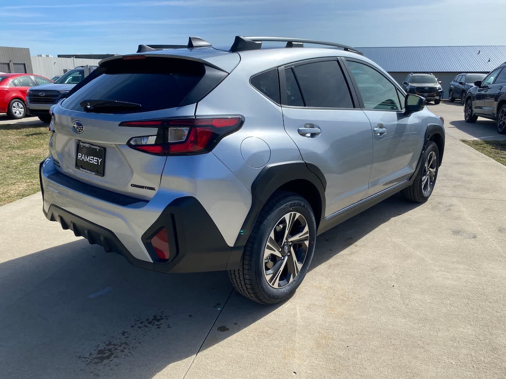 Crosstrek Premium is nicely equipped with Standard Model, 4-Wheel Disc Brakes, 6 Speakers, ABS brakes, Air Conditioning, All-Weather Floor Liners, Alloy wheels, AM/FM radio: SiriusXM with 360L, Anti-whiplash front head restraints, Auto High-beam Headlights, Auto-Dimming Mirror with Compass and HomeLink, Automatic temperature control, Brake assist, Bumpers: body-color, Cloth Upholstery, Driver door bin, Driver vanity mirror, Dual front impact airbags, Dual front side impact airbags, Electronic Stability Control, Emergency communication system: MySubaru Companion (5-years free), Exterior Parking Camera Rear, Four wheel independent suspension, Front anti-roll bar, Front Bucket Seats, Front Center Armrest, Front dual zone A/C, Front fog lights, Front reading lights, Fully automatic headlights, Illuminated entry, Knee airbag, Low tire pressure warning, Occupant sensing airbag, Outside temperature display, Overhead airbag, Overhead console, Panic alarm, Passenger door bin, Passenger vanity mirror, Power door mirrors, Power steering, Power windows, Radio data system, Radio: Subaru 11.6 Multimedia Plus System, Rear anti-roll bar, Rear Bumper Cover, Rear seat center armrest, Rear side impact airbag, Rear window defroster, Rear window wiper, Remote keyless entry, Security system, Speed control, Speed-sensing steering, Split folding rear seat, Spoiler, Steering wheel mounted audio controls, Tachometer, Telescoping steering wheel, Tilt steering wheel, Traction control, Trip computer, Turn signal indicator mirrors, Variably intermittent wipers, and Wheels: 17 x 7.0 J Machine Finish Aluminum-Alloy.