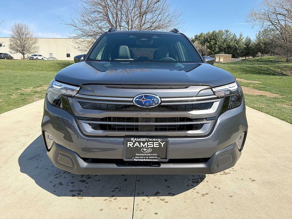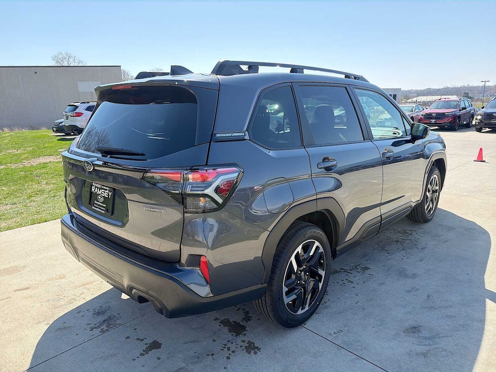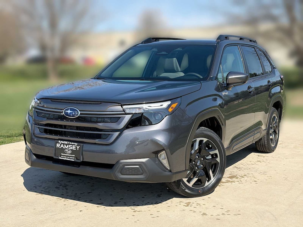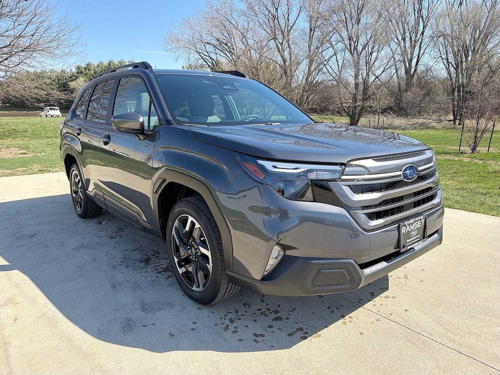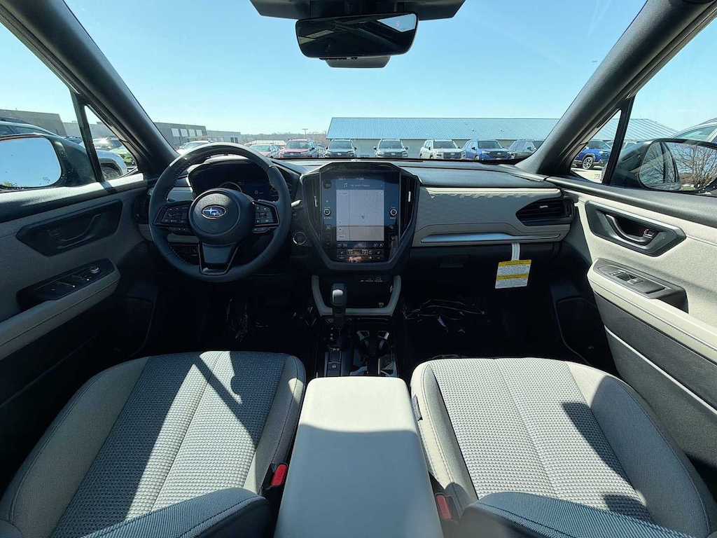 Forester Premium is nicely equipped with Standard Model, 4-Wheel Disc Brakes, 6 Speakers, ABS brakes, Air Conditioning, All-Weather Floor Liners, Alloy wheels, AM/FM radio: SiriusXM with 360L, Anti-whiplash front head restraints, Auto High-beam Headlights, Auto-Dimming Mirror with Compass and HomeLink, Automatic temperature control, Brake assist, Bumpers: body-color, Cargo Tray, Compass, Driver door bin, Driver vanity mirror, Dual front impact airbags, Dual front side impact airbags, Electronic Stability Control, Emergency communication system: MySubaru Companion (5-years free), Exterior Parking Camera Rear, Four wheel independent suspension, Front anti-roll bar, Front Bucket Seats, Front Center Armrest, Front dual zone A/C, Front fog lights, Front reading lights, Fully automatic headlights, Heated door mirrors, Heated Front Bucket Seats, Heated front seats, Illuminated entry, Knee airbag, Low tire pressure warning, Navigation System, Occupant sensing airbag, Outside temperature display, Overhead airbag, Overhead console, Panic alarm, Passenger door bin, Passenger vanity mirror, Power door mirrors, Power driver seat, Power Liftgate, Power moonroof: Panoramic, Power steering, Power windows, Premium Textured Cloth Upholstery, Radio data system, Radio: Subaru 11.6 Multimedia Navigation System, Rear anti-roll bar, Rear seat center armrest, Rear Seatback Protector, Rear window defroster, Rear window wiper, Remote keyless entry, Security system, Speed control, Speed-sensing steering, Split folding rear seat, Spoiler, Steering wheel mounted audio controls, Tachometer, Telescoping steering wheel, Tilt steering wheel, Traction control, Trip computer, Variably intermittent wipers, and Wheels: 18 x 7.0 J Dark Metallic Aluminum-Alloy.