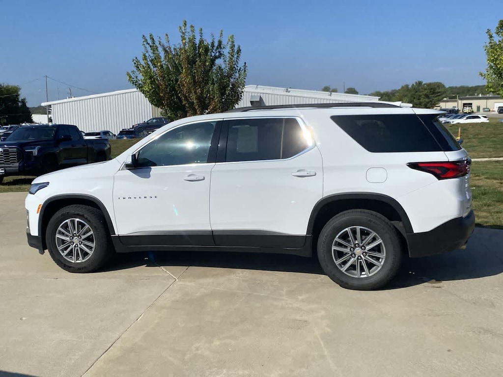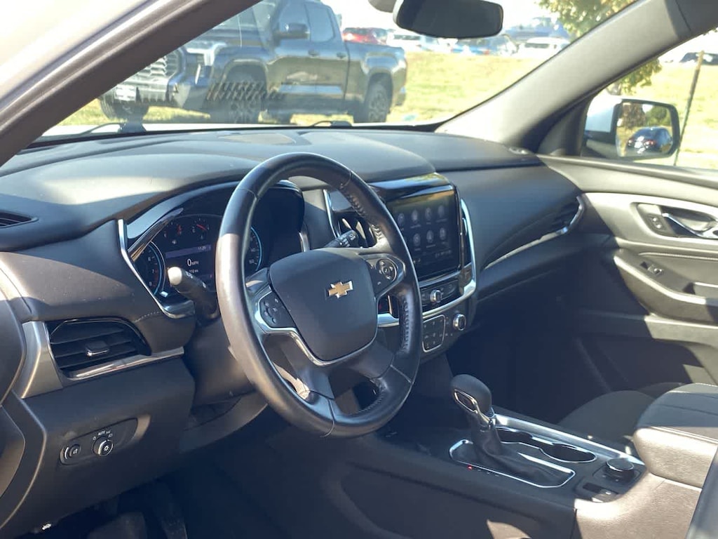 Traverse LT is nicely equipped with Preferred Equipment Group 1LT (Heated Driver & Front Passenger Seats and Rear Park Assist w/Audible Warning), AWD, 2-Way Manual Front Passenger Seat Adjuster, 3.49 Axle Ratio, 3rd row seats: split-bench, 4-Wheel Disc Brakes, 6 Speakers, 6-Speaker Audio System Feature, 8-Way Power Driver Seat Adjuster, ABS brakes, Air Conditioning, Alloy wheels, AM/FM radio: SiriusXM, Apple CarPlay/Android Auto, Auto High-beam Headlights, Automatic temperature control, Black Roof Rails, Brake assist, Bumpers: body-color, Compass, Delay-off headlights, Driver door bin, Driver vanity mirror, Dual front impact airbags, Dual front side impact airbags, Electronic Stability Control, Emergency communication system: OnStar Guidance, Exterior Parking Camera Rear, Four wheel independent suspension, Front anti-roll bar, Front Bucket Seats, Front Center Armrest, Front dual zone A/C, Front reading lights, Fully automatic headlights, Garage door transmitter, Heated door mirrors, Heated front seats, Illuminated entry, Leather steering wheel, Low tire pressure warning, Not Equipped w/Dr & Fr Pass Heated or Ventilated Seats, Occupant sensing airbag, Outside temperature display, Overhead airbag, Overhead console, Panic alarm, Passenger door bin, Passenger vanity mirror, Power door mirrors, Power Driver Lumbar Control, Power driver seat, Power Liftgate, Power steering, Power windows, Premium Cloth Seat Trim, Radio data system, Radio: Chevrolet Infotainment 3 Plus System, Rear air conditioning, Rear anti-roll bar, Rear reading lights, Rear window defroster, Rear window wiper, Remote keyless entry, Roof rack: rails only, Security system, SiriusXM w/360L, Speed control, Speed-sensing steering, Spoiler, Steering wheel mounted audio controls, Tachometer, Telescoping steering wheel, Tilt steering wheel, Traction control, Trip computer, Turn signal indicator mirrors, Variably intermittent wipers, Voltmeter, and Wheels: 18 Bright Silver-Painted Aluminum.