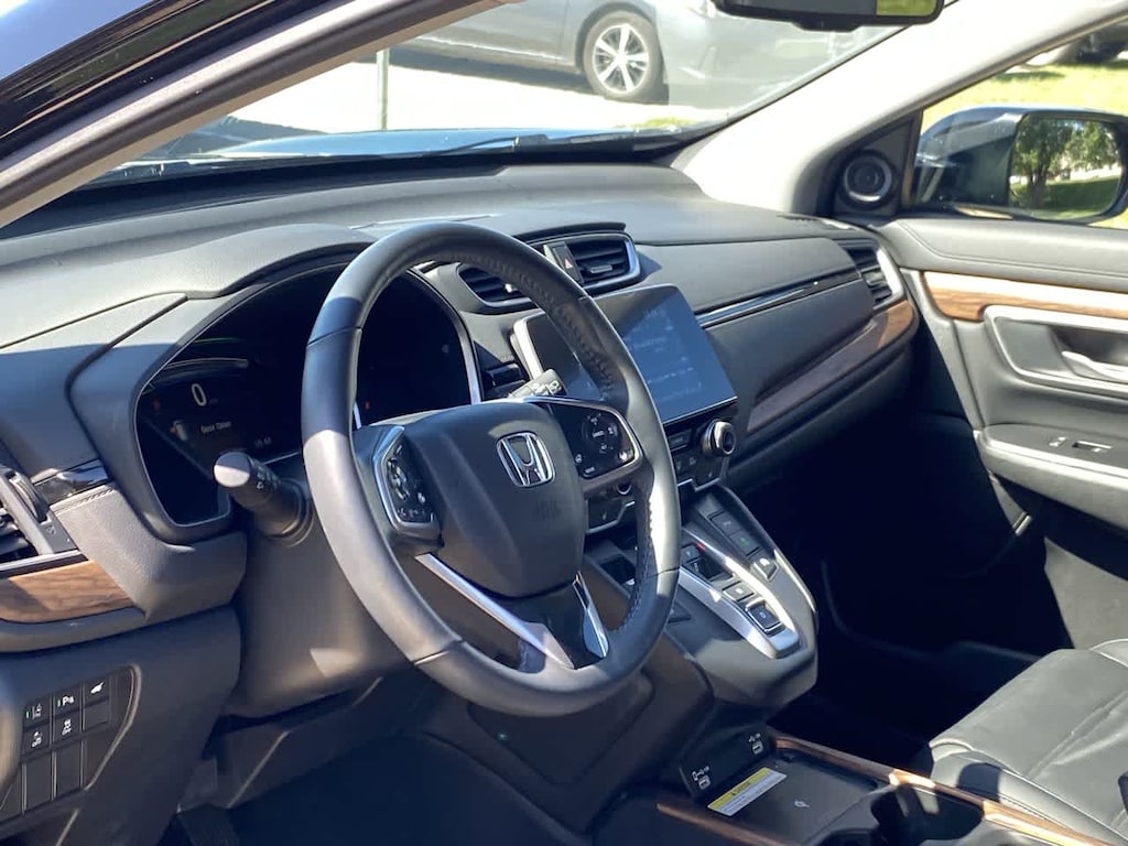 CR-V Hybrid Touring is nicely equipped with 2.0L I4 DOHC 16V, Navigation system: Honda Satellite-Linked Navigation System, 4-Wheel Disc Brakes, 9 Speakers, ABS brakes, Adaptive Cruise Control: Adaptive Cruise Control (ACC) with Low-Speed Follow, Air Conditioning, Alloy wheels, AM/FM radio: SiriusXM, Apple CarPlay/Android Auto, Auto High-beam Headlights, Auto-dimming Rear-View mirror, Automatic temperature control, Blind Spot Information (BSI) System warning, Brake assist, Bumpers: body-color, Compass, Delay-off headlights, Driver door bin, Driver vanity mirror, Dual front impact airbags, Dual front side impact airbags, Electronic Stability Control, Exterior Parking Camera Rear, Forward collision: Collision Mitigation Braking System (CMBS) + FCW mitigation, Four wheel independent suspension, Front anti-roll bar, Front Bucket Seats, Front Center Armrest, Front dual zone A/C, Front fog lights, Front reading lights, Garage door transmitter: HomeLink, Heated door mirrors, Heated Front Bucket Seats, Heated front seats, Heated steering wheel, Illuminated entry, Leather Seat Trim, Low tire pressure warning, Memory seat, Occupant sensing airbag, Outside temperature display, Overhead airbag, Overhead console, Panic alarm, Passenger door bin, Passenger vanity mirror, Power door mirrors, Power driver seat, Power Liftgate, Power moonroof, Power passenger seat, Power steering, Power windows, Radio data system, Radio: 330-Watt AM/FM/HD/SiriusXM Prem Audio System, Rain sensing wipers, Rear anti-roll bar, Rear seat center armrest, Rear window defroster, Rear window wiper, Remote keyless entry, Roof rack: rails only, Security system, Speed control, Speed-sensing steering, Speed-Sensitive Wipers, Split folding rear seat, Spoiler, Steering wheel mounted audio controls, TBD Axle Ratio, Telescoping steering wheel, Tilt steering wheel, Traction control, Trip computer, Turn signal indicator mirrors, Variably intermittent wipers, and Wheels: 19 Machine-Finished Alloy w/Gray Inserts.