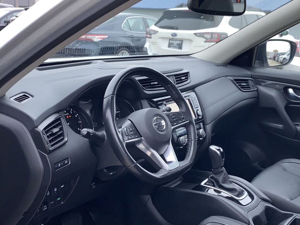 Rogue SL is nicely equipped with Platinum Package (19 Alloy Wheels, Forward Emergency Braking, Intelligent Cruise Control, Lane Departure Prevention, and Lane Departure Warning System), SL Premium Package, AWD, 4-Wheel Disc Brakes, 9 Speakers, ABS brakes, Air Conditioning, Alloy wheels, AM/FM radio: SiriusXM, Anti-whiplash front head restraints, Auto High-beam Headlights, Auto-dimming Rear-View mirror, Automatic temperature control, Black Splash Guards (Set of 4), Blind Spot Warning, Brake assist, Bumpers: body-color, CD player, Chrome Rear Bumper Protector, Delay-off headlights, Driver door bin, Driver vanity mirror, Dual front impact airbags, Dual front side impact airbags, Electronic Stability Control, Emergency communication system, Floor Mats & 2-PC Cargo Area Protector (DISC), Four wheel independent suspension, Front anti-roll bar, Front Bucket Seats, Front Center Armrest w/Storage, Front dual zone A/C, Front fog lights, Front reading lights, Fully automatic headlights, Garage door transmitter: HomeLink, Heated door mirrors, Heated front seats, Heated steering wheel, Illuminated entry, Leather Appointed Seat Trim, Leather Shift Knob, Low tire pressure warning, Memory seat, Navigation System, Occupant sensing airbag, Outside temperature display, Overhead airbag, Overhead console, Panic alarm, Passenger door bin, Passenger vanity mirror, Power door mirrors, Power driver seat, Power Liftgate, Power steering, Power windows, Quick Comfort Heated Front Bucket Seats, Radio data system, Radio: AM/FM/CD/RDS/AUX NissanConnect w/Navigation, Rear anti-roll bar, Rear seat center armrest, Rear window defroster, Rear window wiper, Remote keyless entry, Roof rack: rails only, Security system, Speed control, Speed-sensing steering, Split folding rear seat, Spoiler, Steering wheel mounted audio controls, Tachometer, Telescoping steering wheel, Tilt steering wheel, Traction control, Trip computer, Turn signal indicator mirrors, and Variably intermittent wipers.