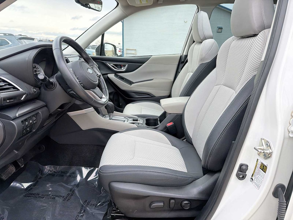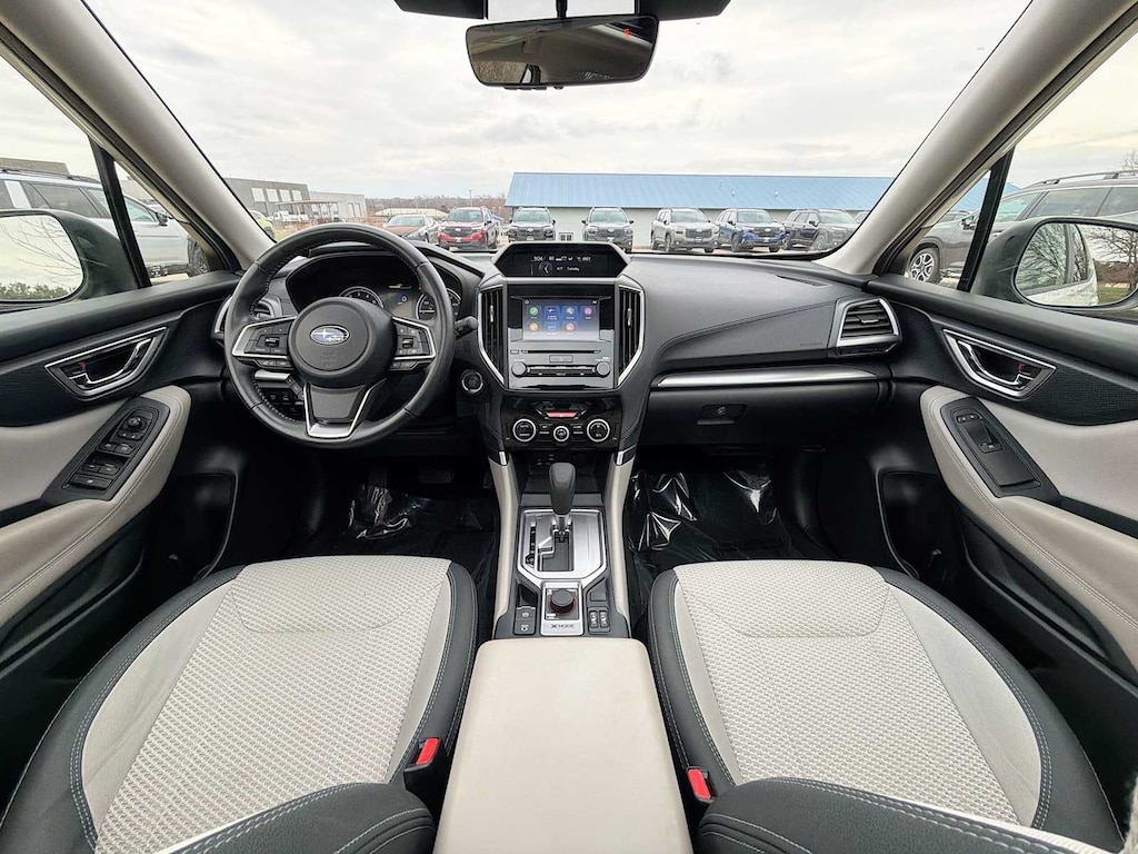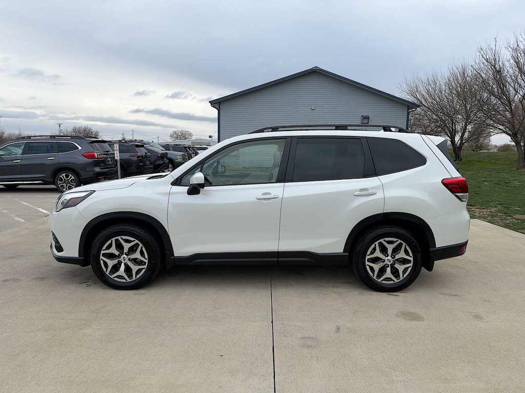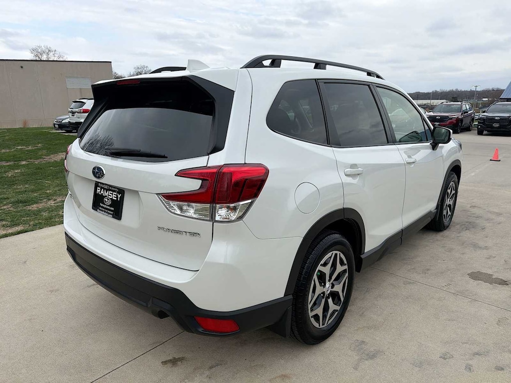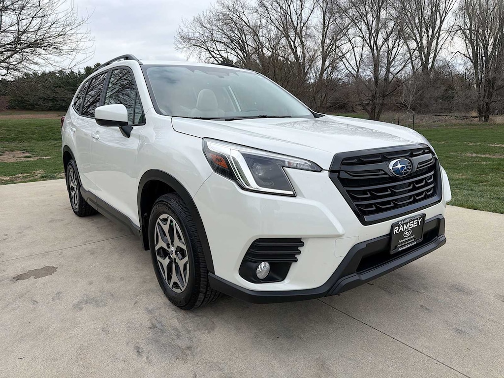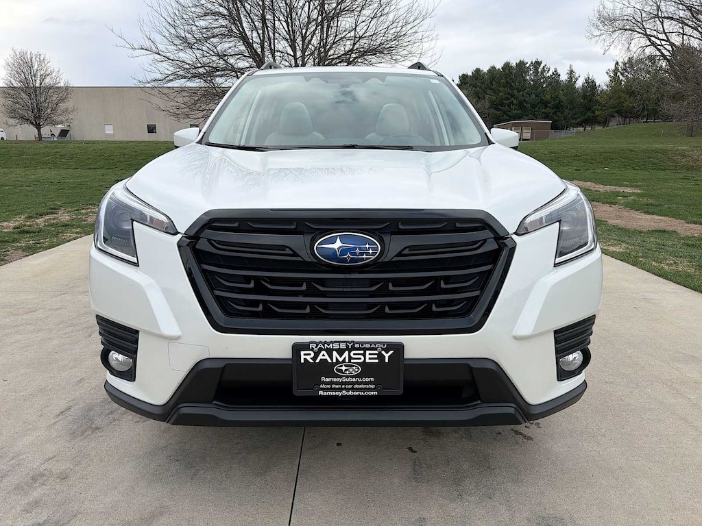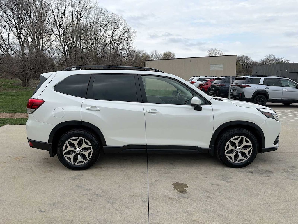 Forester Premium is nicely equipped with Blind Spot Detection w/RCTA & Power Rear Gate (Blind Spot Detection (BSD), Drivers Seatback Divided Pocket, Dual USB Charge Ports, EyeSight System, Multi-Function High Grade Display, and Power Rear Gate), Subaru Certified Pre-Owned Certified, 3.70 Axle Ratio, 4-Wheel Disc Brakes, 6 Speakers, ABS brakes, Air Conditioning, All-Weather Floor Liners, Alloy wheels, AM/FM radio: SiriusXM, Anti-whiplash front head restraints, Auto High-beam Headlights, Auto-Dimming Exterior Mirror w/Approach Lighting, Auto-Dimming Mirror w/Compass & HomeLink, Automatic temperature control, Brake assist, Bumpers: body-color, Cargo Net, Cargo Tray, CD player, Driver door bin, Driver vanity mirror, Dual front impact airbags, Dual front side impact airbags, Electronic Stability Control, Emergency communication system: STARLINK Safety and Security (Subscription Required), Exterior Parking Camera Rear, Four wheel independent suspension, Front anti-roll bar, Front Bucket Seats, Front Center Armrest, Front fog lights, Front reading lights, Fully automatic headlights, Heated door mirrors, Heated Front Bucket Seats, Heated front seats, Illuminated entry, Knee airbag, Low tire pressure warning, Occupant sensing airbag, Outside temperature display, Overhead airbag, Overhead console, Panic alarm, Passenger door bin, Passenger vanity mirror, Power door mirrors, Power driver seat, Power moonroof: Panoramic, Power steering, Power windows, Premium Cloth Upholstery, Radio data system, Radio: Subaru Starlink 6.5 Multimedia Plus System, Rear anti-roll bar, Rear seat center armrest, Rear Seatback Protector, Rear window defroster, Rear window wiper, Remote keyless entry, Roof rack: rails only, Security system, Speed control, Speed-sensing steering, Split folding rear seat, Spoiler, STARLINK/Apple CarPlay/Android Auto, Steering wheel mounted audio controls, Tachometer, Telescoping steering wheel, Tilt steering wheel, Traction control, Trip computer, Variably intermittent wipers, and Wheels: 17 x 7.0J Black Machine Finish Alloy.