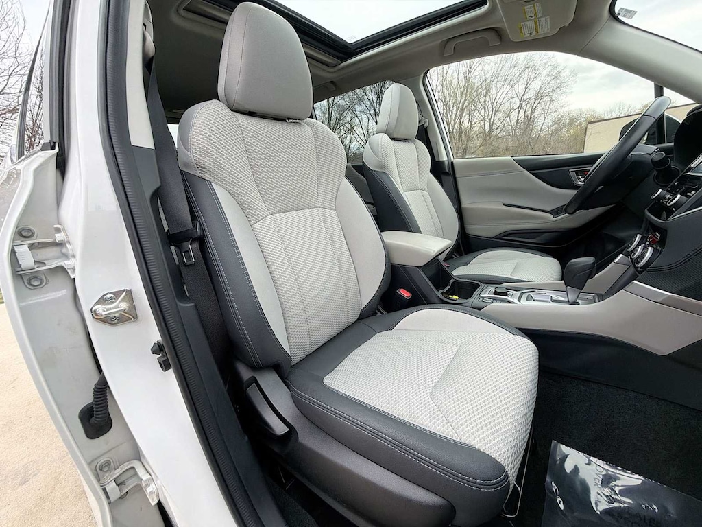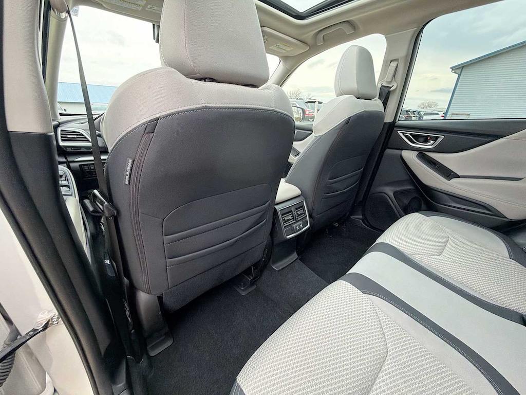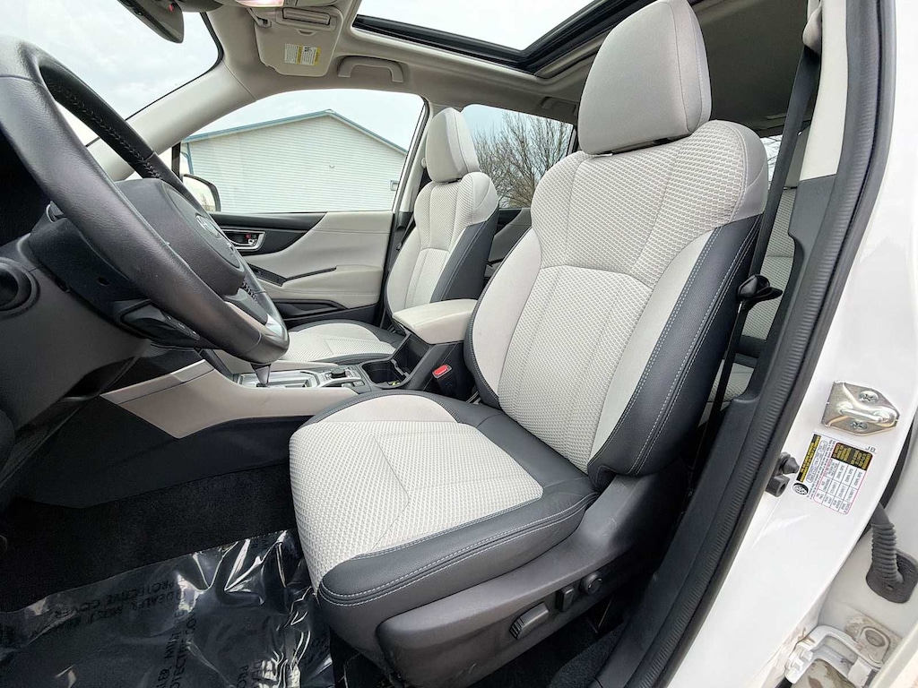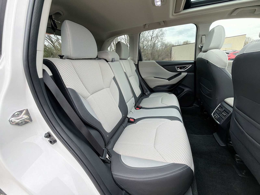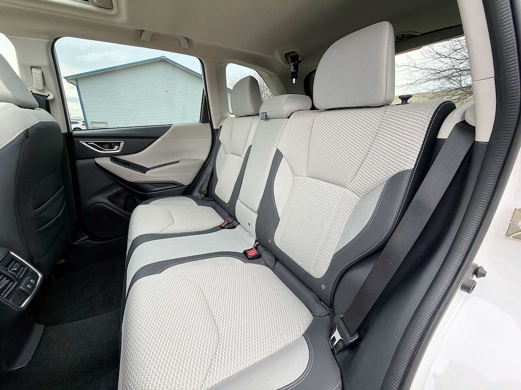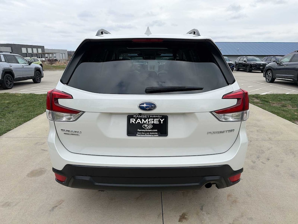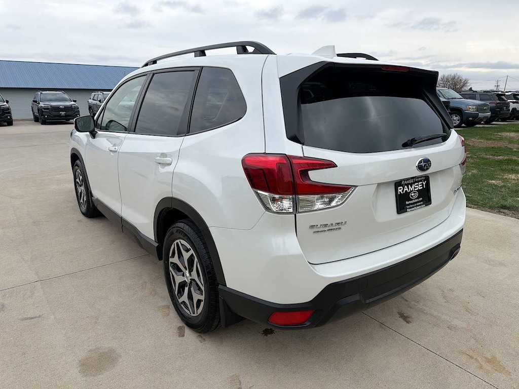Forester Premium is nicely equipped with Blind Spot Detection w/RCTA & Power Rear Gate (Blind Spot Detection (BSD), Drivers Seatback Divided Pocket, Dual USB Charge Ports, EyeSight System, Multi-Function High Grade Display, and Power Rear Gate), Subaru Certified Pre-Owned Certified, 3.70 Axle Ratio, 4-Wheel Disc Brakes, 6 Speakers, ABS brakes, Air Conditioning, All-Weather Floor Liners, Alloy wheels, AM/FM radio: SiriusXM, Anti-whiplash front head restraints, Auto High-beam Headlights, Auto-Dimming Exterior Mirror w/Approach Lighting, Auto-Dimming Mirror w/Compass & HomeLink, Automatic temperature control, Brake assist, Bumpers: body-color, Cargo Net, Cargo Tray, CD player, Driver door bin, Driver vanity mirror, Dual front impact airbags, Dual front side impact airbags, Electronic Stability Control, Emergency communication system: STARLINK Safety and Security (Subscription Required), Exterior Parking Camera Rear, Four wheel independent suspension, Front anti-roll bar, Front Bucket Seats, Front Center Armrest, Front fog lights, Front reading lights, Fully automatic headlights, Heated door mirrors, Heated Front Bucket Seats, Heated front seats, Illuminated entry, Knee airbag, Low tire pressure warning, Occupant sensing airbag, Outside temperature display, Overhead airbag, Overhead console, Panic alarm, Passenger door bin, Passenger vanity mirror, Power door mirrors, Power driver seat, Power moonroof: Panoramic, Power steering, Power windows, Premium Cloth Upholstery, Radio data system, Radio: Subaru Starlink 6.5 Multimedia Plus System, Rear anti-roll bar, Rear seat center armrest, Rear Seatback Protector, Rear window defroster, Rear window wiper, Remote keyless entry, Roof rack: rails only, Security system, Speed control, Speed-sensing steering, Split folding rear seat, Spoiler, STARLINK/Apple CarPlay/Android Auto, Steering wheel mounted audio controls, Tachometer, Telescoping steering wheel, Tilt steering wheel, Traction control, Trip computer, Variably intermittent wipers, and Wheels: 17 x 7.0J Black Machine Finish Alloy.