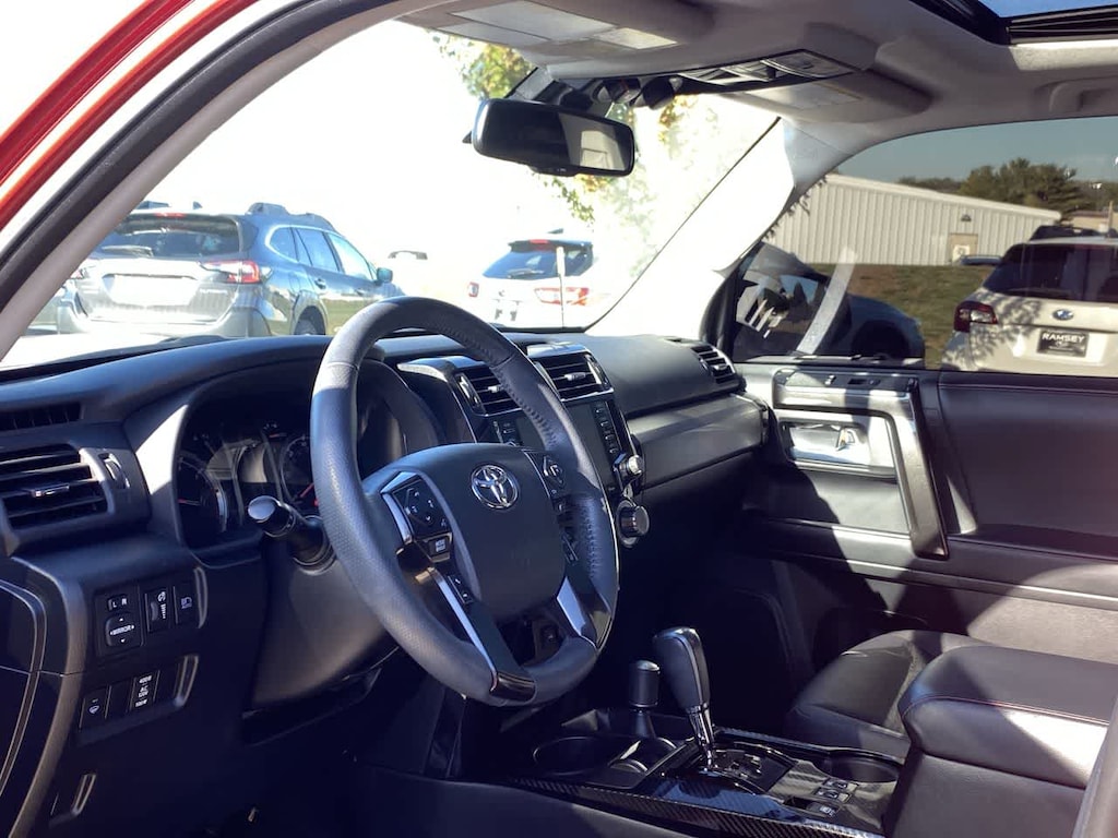 4Runner Venture is nicely equipped with 4WD, Black/Graphite w/Nightshade Leather Seat Trim, 3.727 Axle Ratio, 4-Wheel Disc Brakes, 8 Speakers, ABS brakes, Air Conditioning, Alloy wheels, AM/FM radio: SiriusXM, Anti-whiplash front head restraints, Apple CarPlay/Android Auto, Auto High-beam Headlights, Auto-dimming Rear-View mirror, Black Roof Rails, Body Color Heated Mirrors, Brake assist, Bumpers: body-color, Compass, Driver door bin, Driver vanity mirror, Dual front impact airbags, Dual front side impact airbags, Electronic Stability Control, Emergency communication system: Safety Connect with 1-year trial, Exterior Parking Camera Rear, Front anti-roll bar, Front Bucket Seats, Front Center Armrest, Front fog lights, Front reading lights, Front wheel independent suspension, Garage Door Opener, Garage door transmitter: HomeLink, Heated door mirrors, Heated front seats, Illuminated entry, Knee airbag, Leather Shift Knob, Leather steering wheel, Low tire pressure warning, Navigation System, Occupant sensing airbag, Outside temperature display, Overhead airbag, Overhead console, Panic alarm, Passenger door bin, Passenger vanity mirror, Power door mirrors, Power driver seat, Power passenger seat, Power steering, Power windows, Radio: Premium Audio w/Dynamic Navigation, Rear anti-roll bar, Rear seat center armrest, Rear window defroster, Rear window wiper, Remote keyless entry, Roof rack, Security system, Softex Synthetic Leather Seat Trim, Speed control, Speed-sensing steering, Split folding rear seat, Spoiler, Steering wheel mounted audio controls, Tachometer, Telescoping steering wheel, Tilt steering wheel, Traction control, Trip computer, Turn signal indicator mirrors, Variably intermittent wipers, and Wheels: 17 Matte Black Flow-Formed TRD Alloy.
